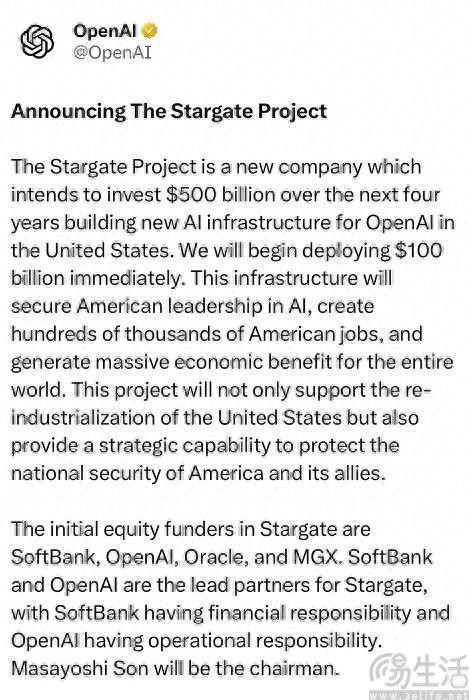 据了解,“星际之门”项目的初始股权出资方包括软银、OpenAI、甲骨文和MGX。其中,软银和OpenAI是该计划的主要合作伙伴,软银负责财务,OpenAI负责运营,软银董事长孙正义则将担任“星际之门”董事长。